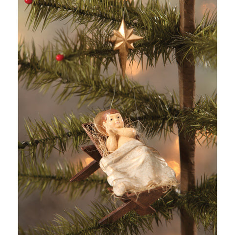 Away in a Manger Ornament reminds us of the true spirit of Christmas. The sweet baby Jesus with his gold halo rests peacefully on a bed of raffia in a manger with a blanket over him. A Star of Bethlehem is suspended above on the hanging wire.