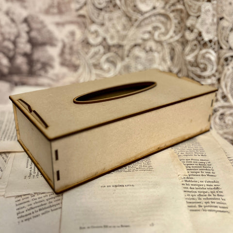 Super cute self assembly rectangular tissue box, manufactured in USA by our partner, Life Beautiful Designs. In this package is a Approx 3 mm thickness kit. Do not glue the top of the box shut, leave unglued so you can place tissues inside. We recommend using Pentart Express glue to assemble our kits.