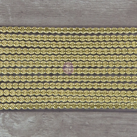 A dainty, narrow Dresden Daisy Chain trim in a gold foil color with a tiny daisy, flower-like motif. Dresden trims were created in the late 1800's in Germany and decorated holiday ornaments and crafts. This Dresden Daisy Chain Trim is made in Germany.