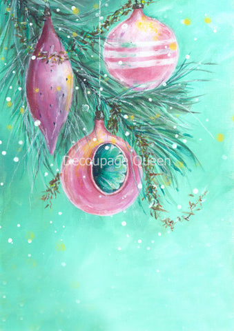 Prettiest shabby pink Christmas ornaments on an aqua background. By Lynn Brundage of Ellen J. Goods for Decoupage Queen.