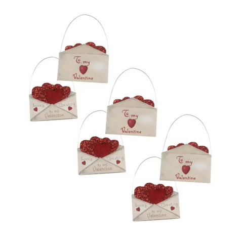A Set of 6 Sweet Valentine Envelope Ornaments with cute hearts peeking out with a vintage inspired Valentine style. Each ornament has To My Valentine and Love's Greeting sentiments printed on them and has a wire hanger. These are small Valentine Ornaments. Perfect for tabletop Valentine trees or tucked into tabletop vignettes. Please see measurements below.