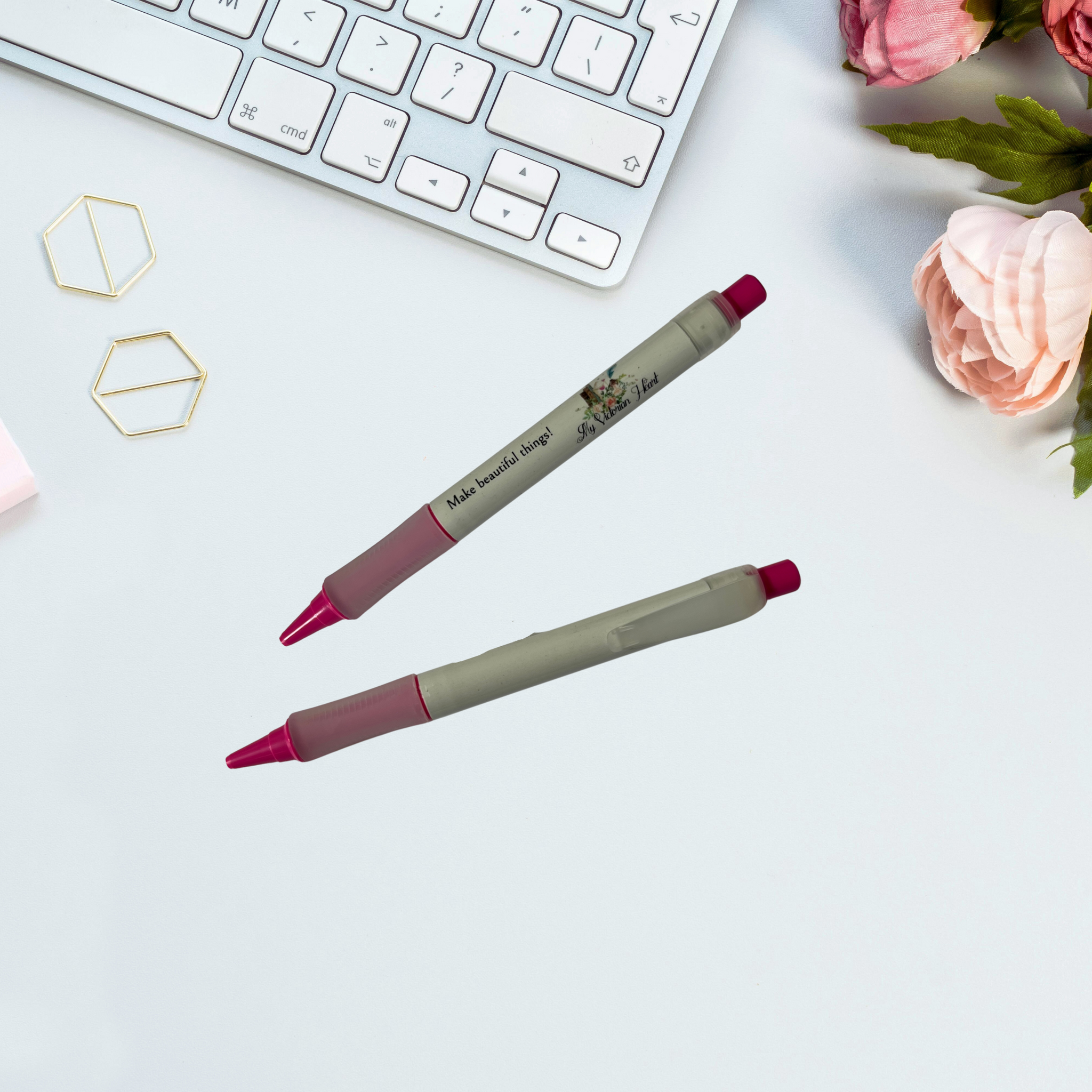 Pink and white gel pen with comfort grip barrel. Writes smoothly. Conveys an inspirational message to “Make beautiful things!” With the My Victorian Heart logo.©️ 2025