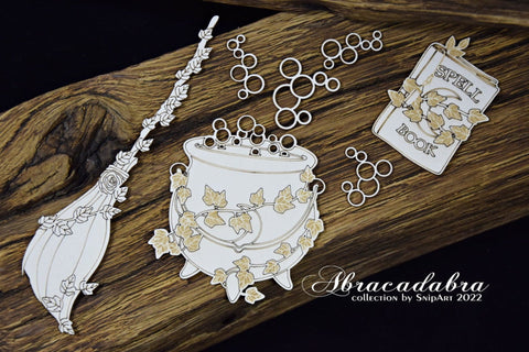A cute cauldron with engraved, vining leaves, bubbles, a book and broom. All in a set by SnipArt Abracadabra line of chipboard embellishments. Fun for Halloween crafts and scrapbooking projects.