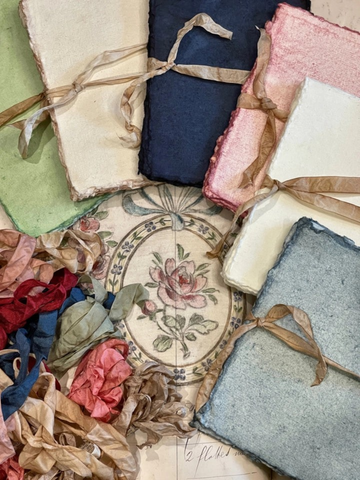 Deckle Edge Paper is, in some ways, a relic of a bygone era, a sign on books and journals of a time before machine cutting and mechanized printing. A gorgeous selection of 5" x 7" handmade cotton rags and recycled paper with fluffy deckle edges. No new trees were used in the production of this paper. It is made from 100% recycled products, and it is dyed in the colors we love. There are 12 sheets per bundle, which come wrapped in our aged ribbons.