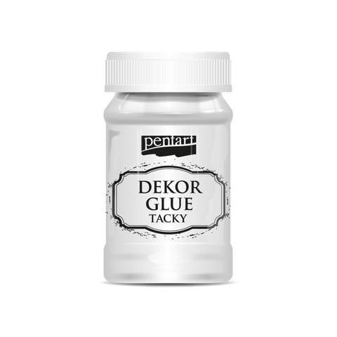 Pentart's Dekor Glue Tacky is a water-based, self-adhesive glue that dries tacky and transparent. Easily spreads evenly. Excellent glue for applying gilding flakes or foils which can also be used to decorate furniture or other larger surfaces and other decor materials without brush marks.