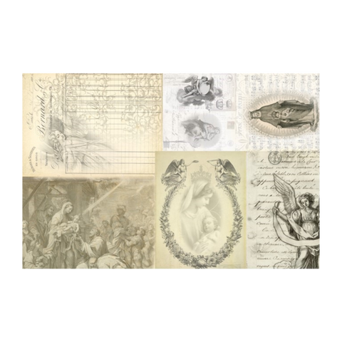 Angels Masterboard is a beautiful collection of antique Angels and varied depictions of the Holy Mother or Madonnas with baby Jesus. Designs are on 6 different blocks suitable for all manner of creative projects through the seasons. Several designs are on antique script backgrounds including a French receipt.