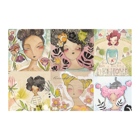 Cori's Girls has 6 colorful, inspiring blocks featuring various women or girls amid florals. Some have a cat and an owl plus a butterfly. Charming designs.