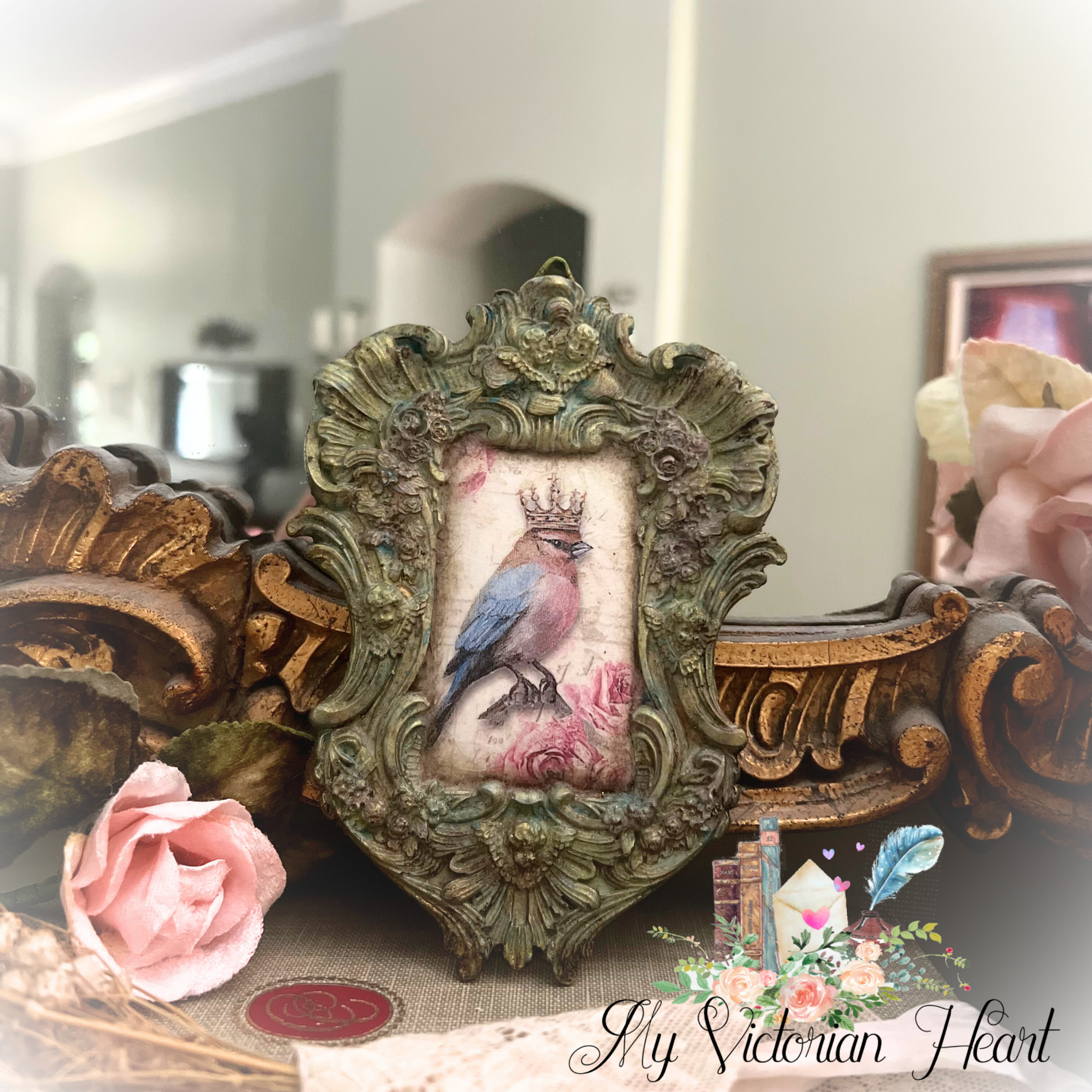 A beautiful, crowned bird perches in her secret garden among pink roses set in an antiqued, mossy, patina-ed frame. Painted, decoupaged and finished in an antiqued style by My Victorian Heart.
