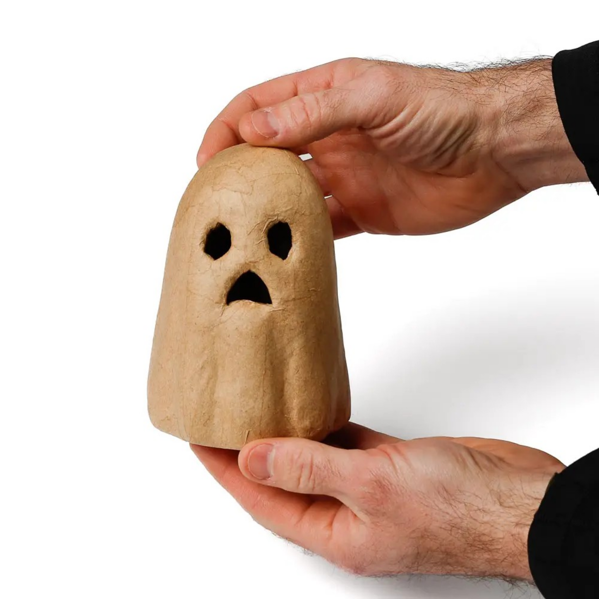 This premade Paper Mache Ghost is crafted from handmade recycled kraft paper. Its dimensional design features cutout eyes and a mouth, giving it a classic ghostly appearance. It is ready to be painted, decoupaged, or embellished to match any Halloween theme.